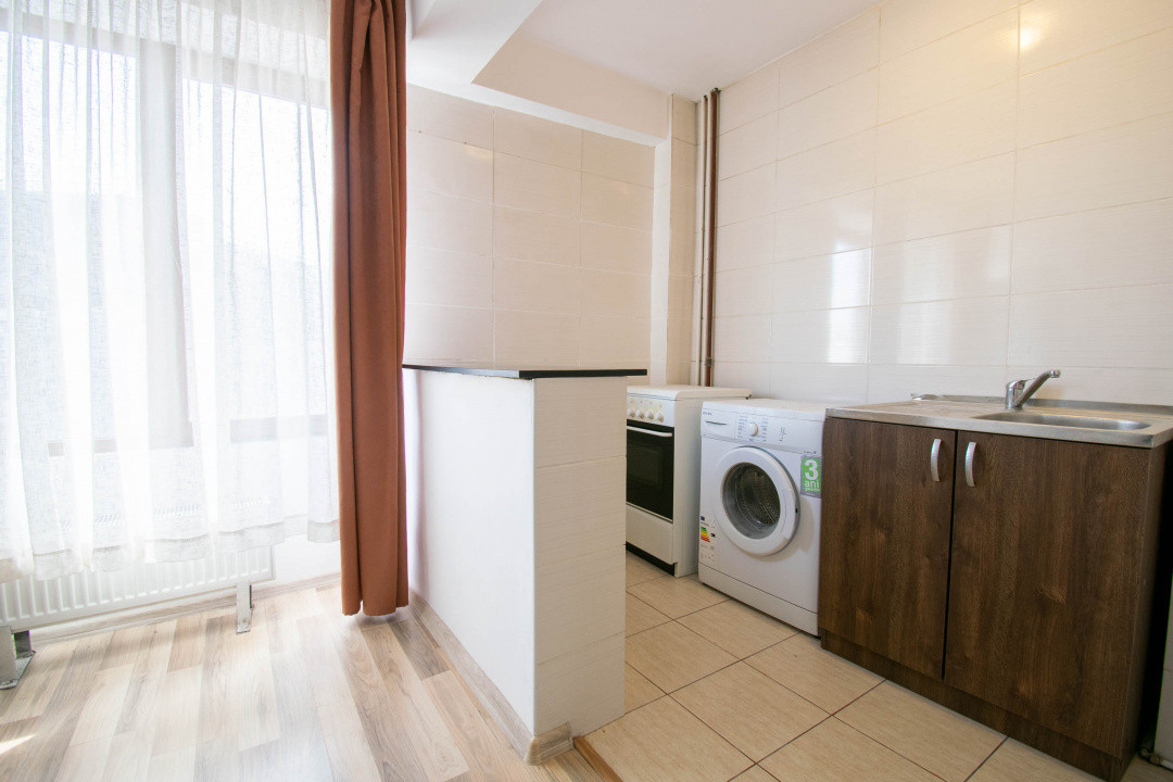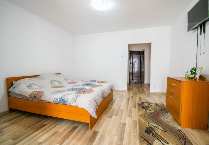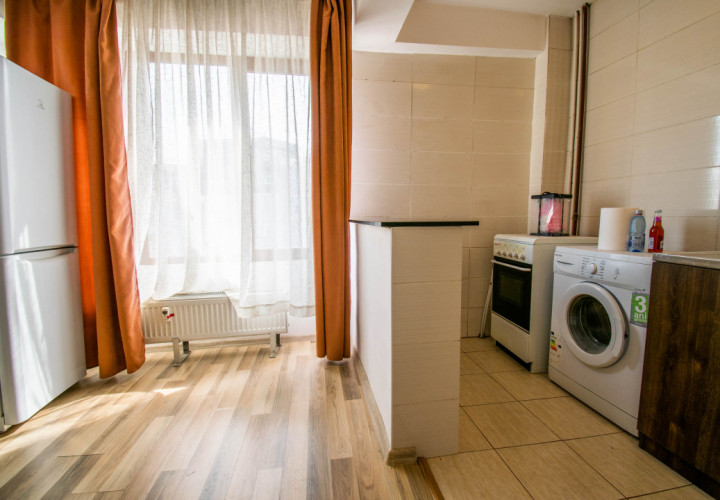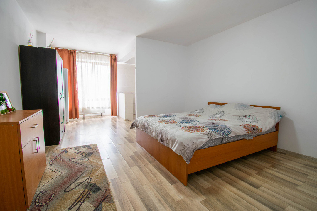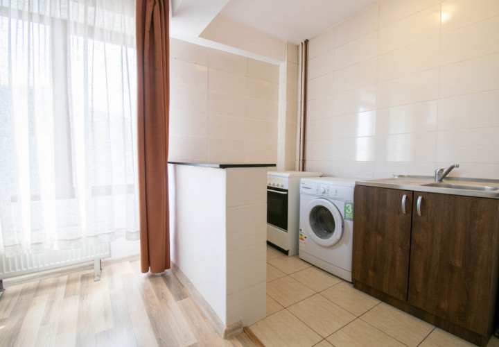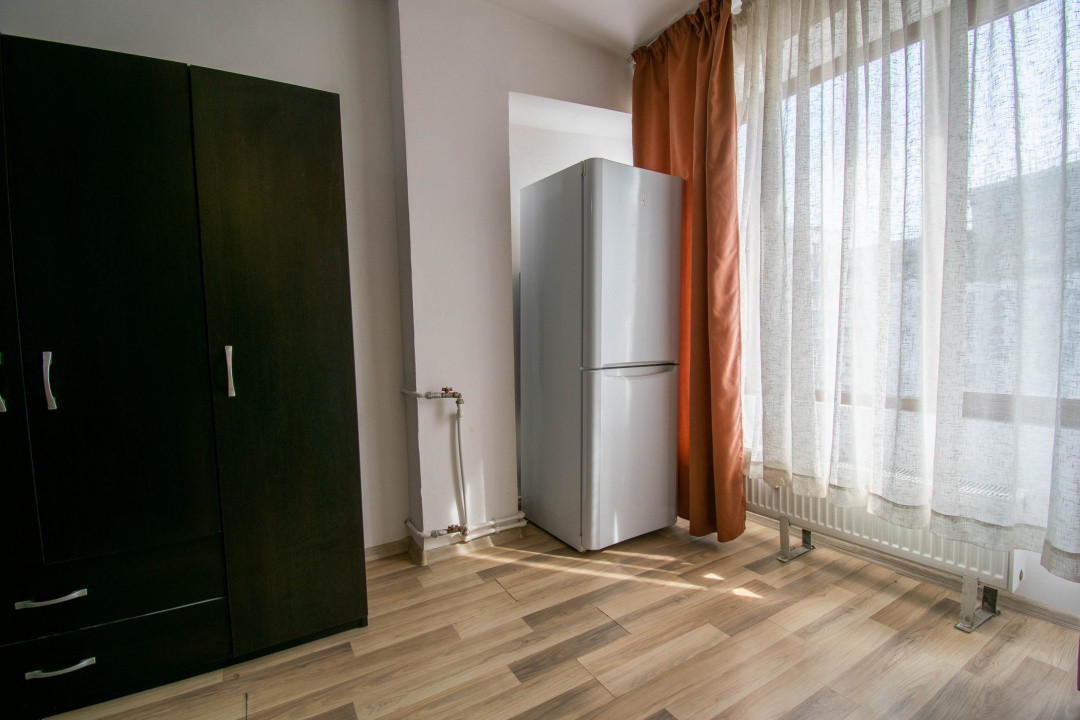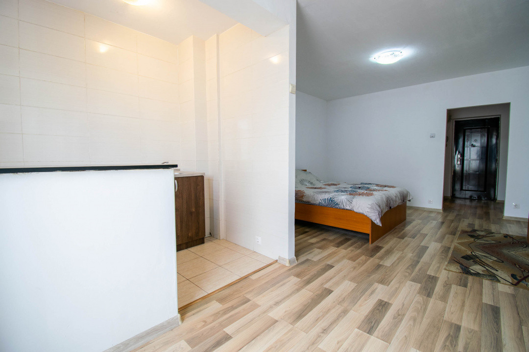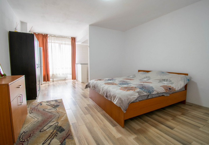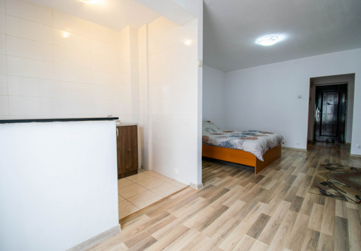 Amplasata la etajul 8 din 10, ofera lumina naturala buna si un plus de intimitate. Spatiul este configurat tip open space,rezultând un spatiu practic si usor de amenajat, dispune de boiler,masina spalat rufe ,frigider,aragaz si tv .