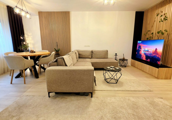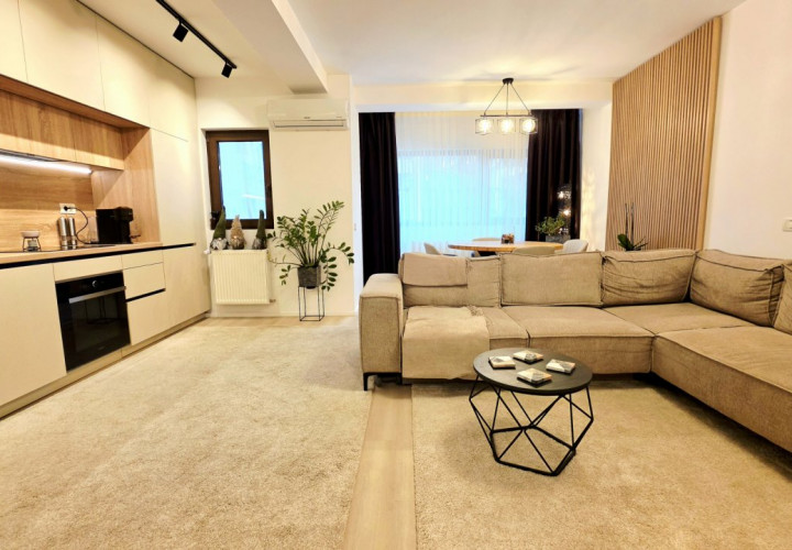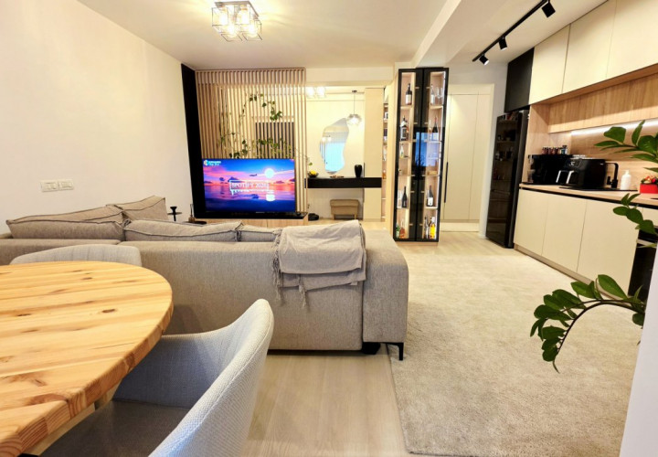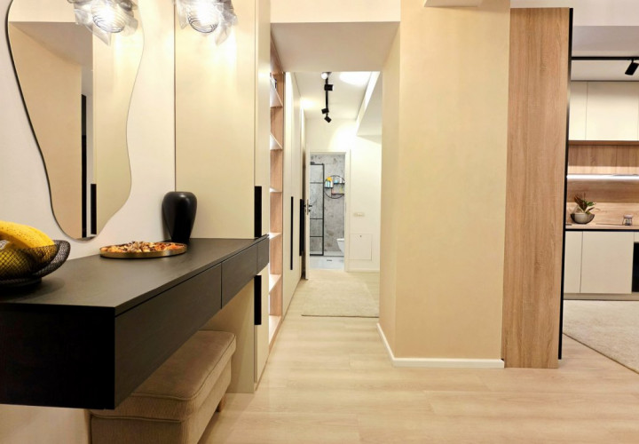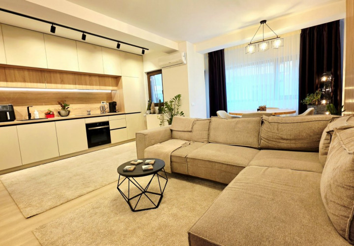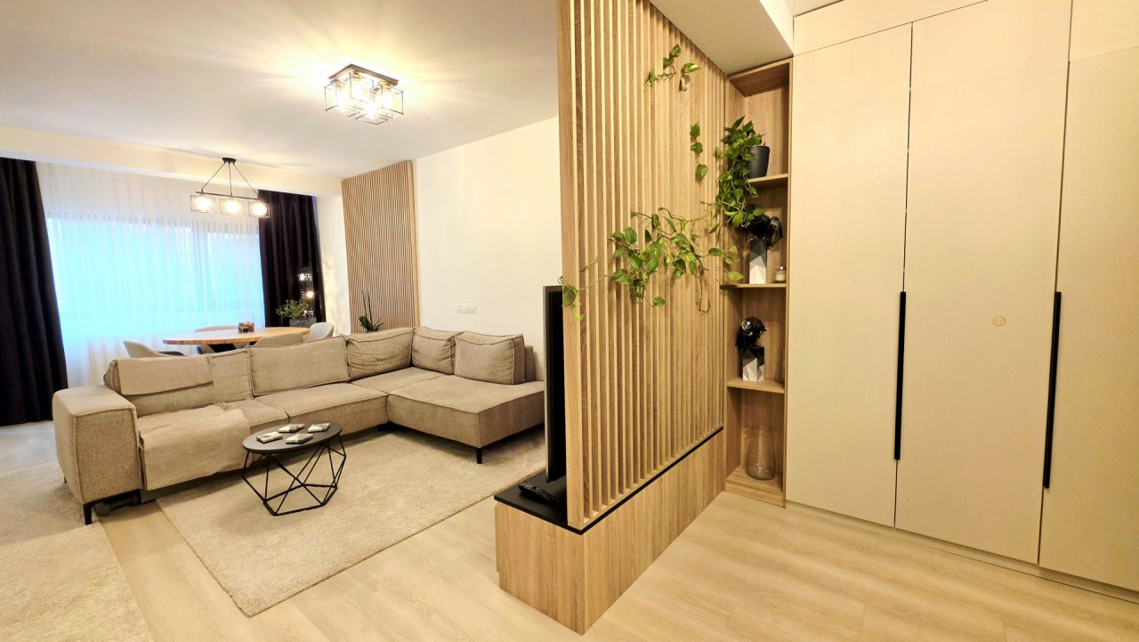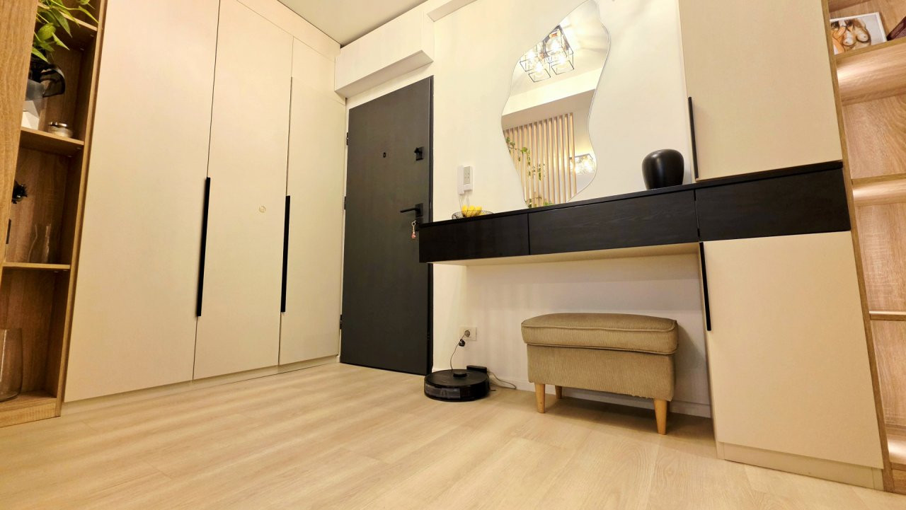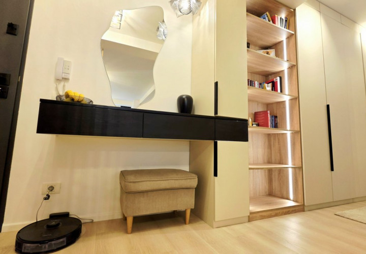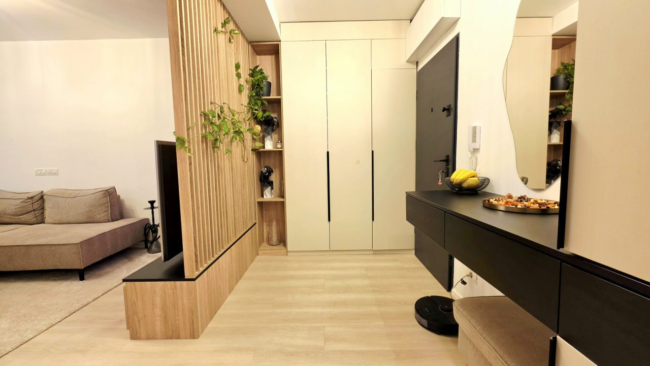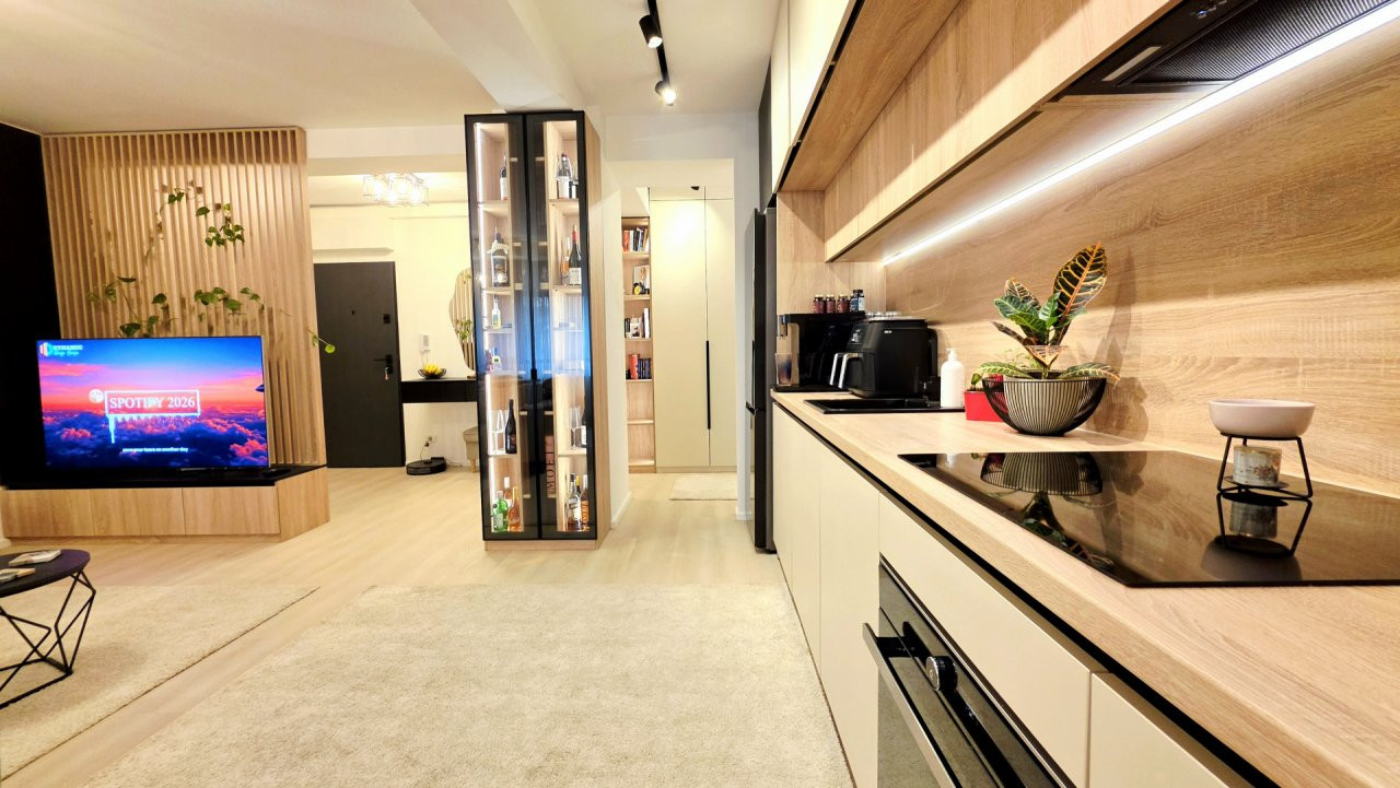Bucataria deschisa cu livingul este mobilata si utilata cu tot ce este necesar. Livingul este minimalist si ultramodern si, odata cu canapeaua extensibila aflata in fata comodei TV, vine la "pachet" si cu o zona de "dressing" suficient de incapatoare pentru cerinta de spatiu pentru haine.