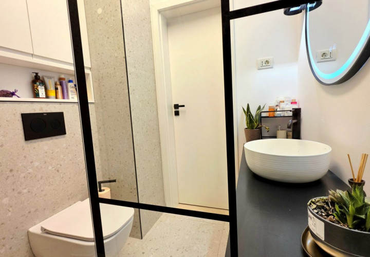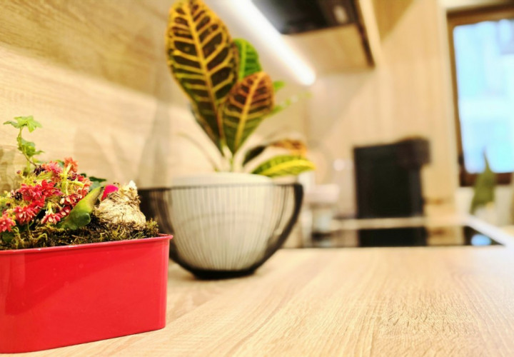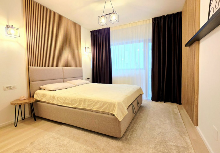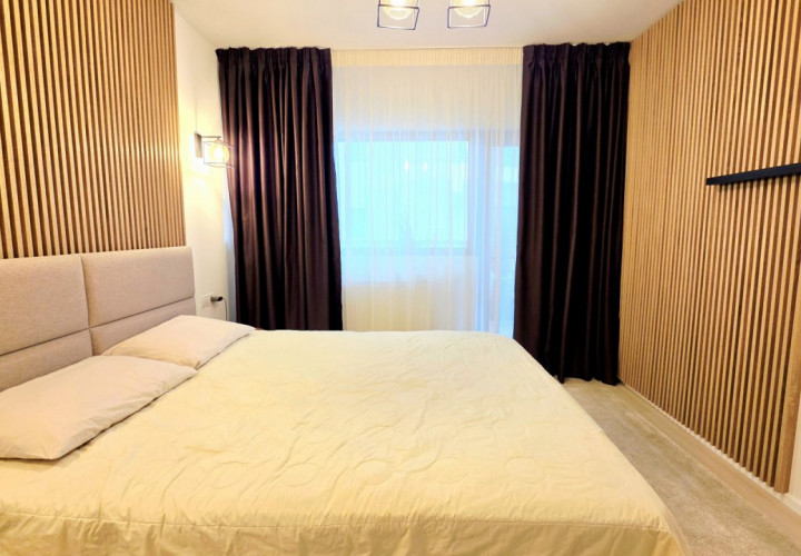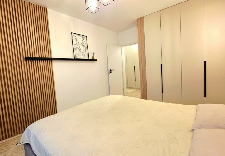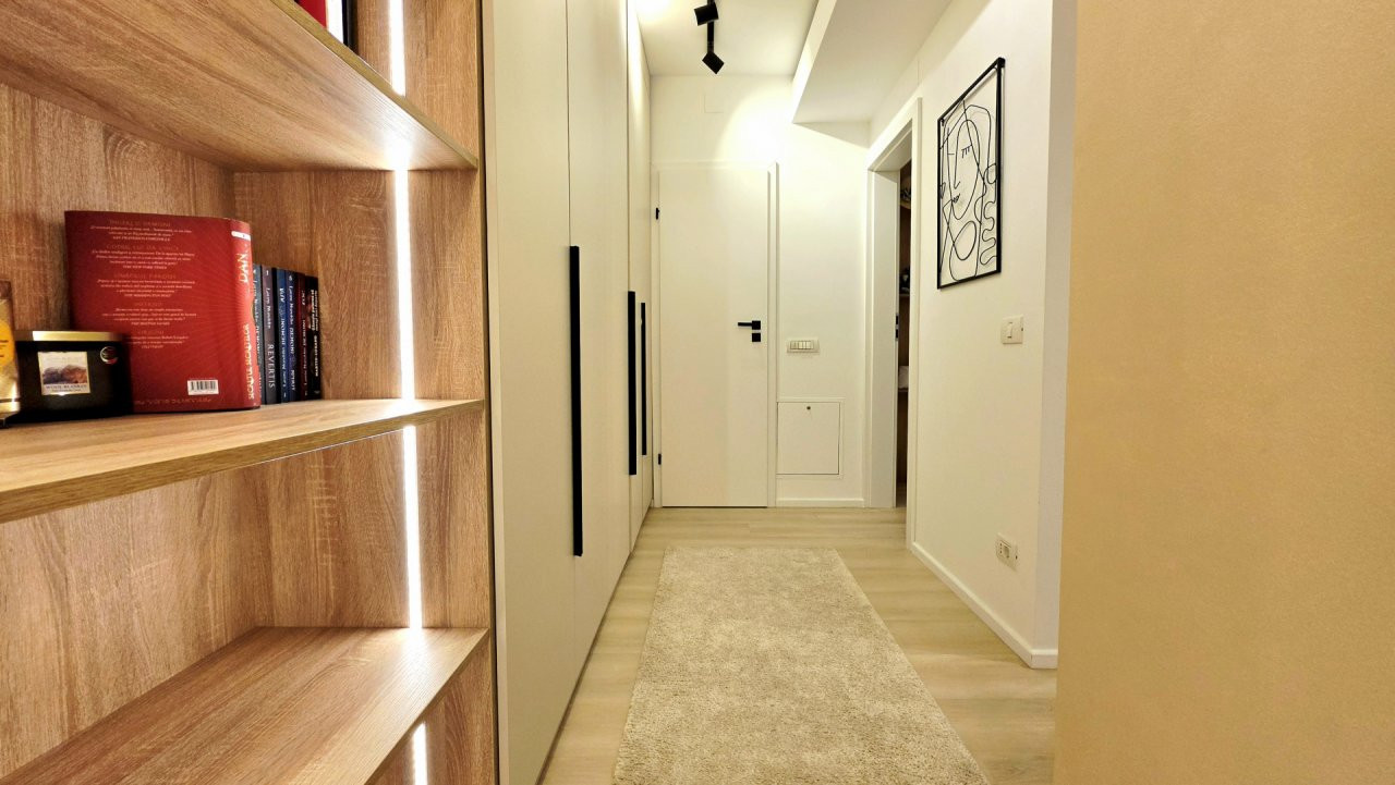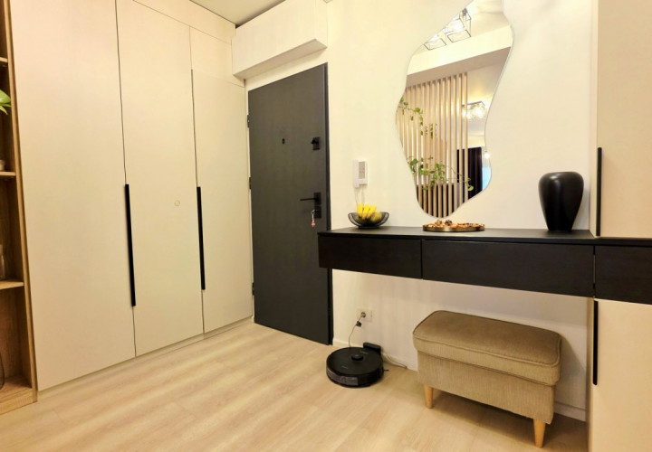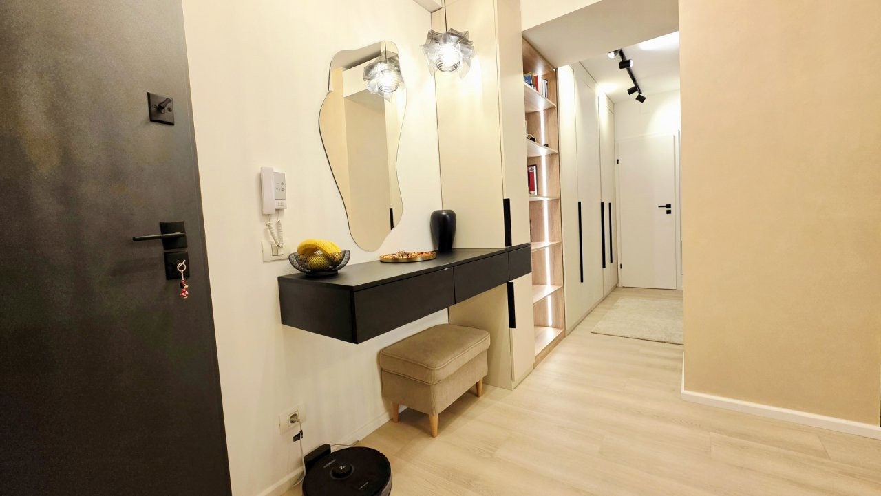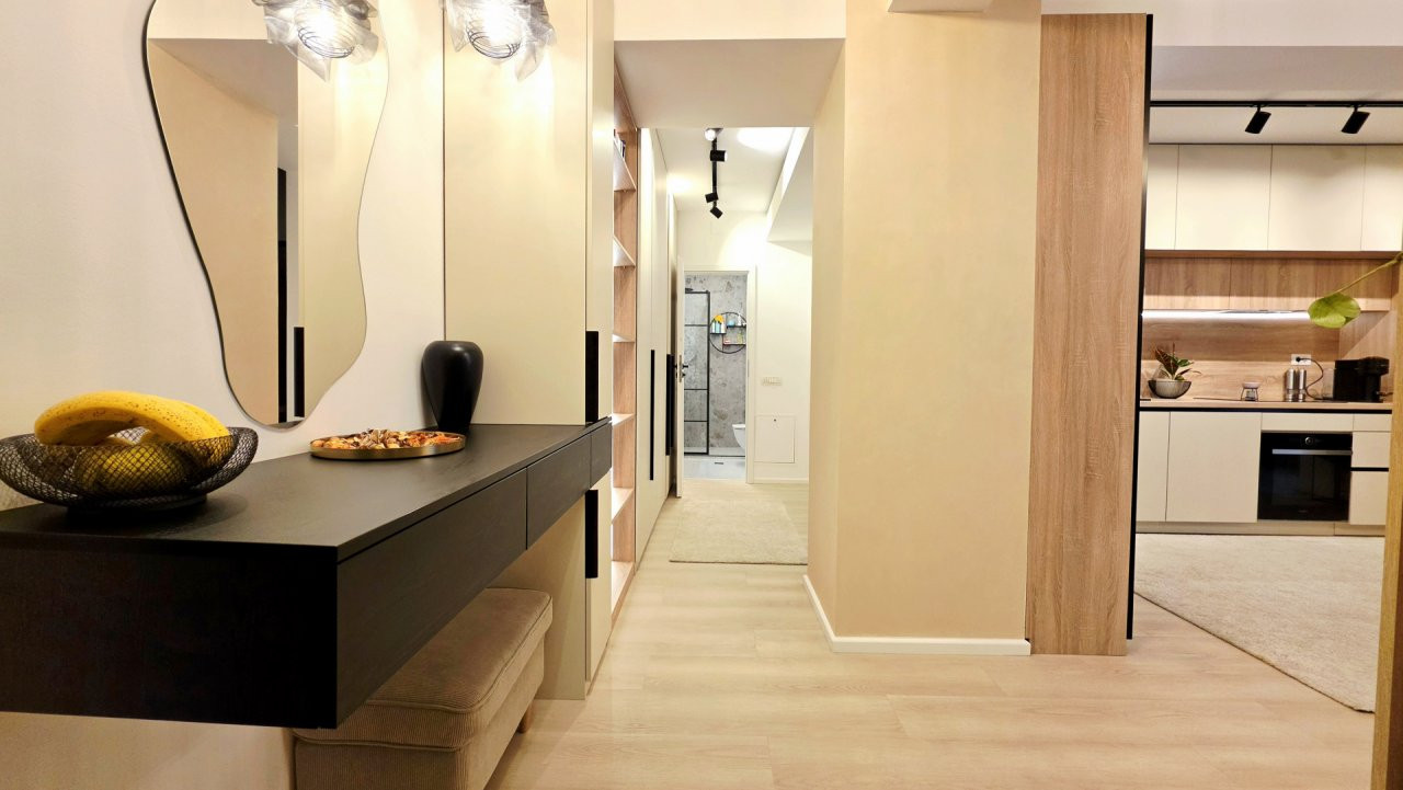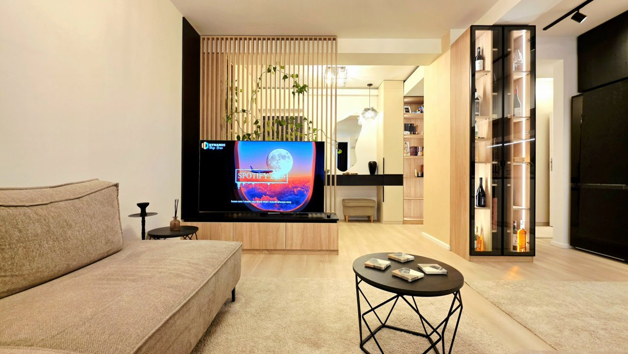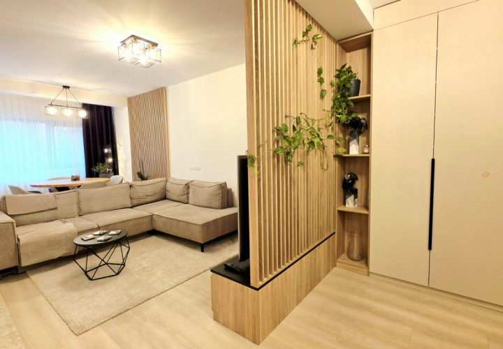 Bucataria deschisa cu livingul este mobilata si utilata cu tot ce este necesar. Livingul este minimalist si ultramodern si, odata cu canapeaua extensibila aflata in fata comodei TV, vine la "pachet" si cu o zona de "dressing" suficient de incapatoare pentru cerinta de spatiu pentru haine.