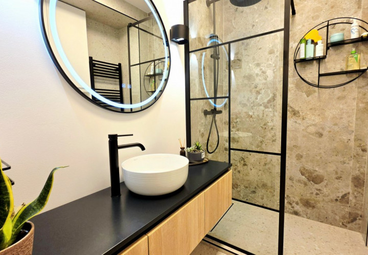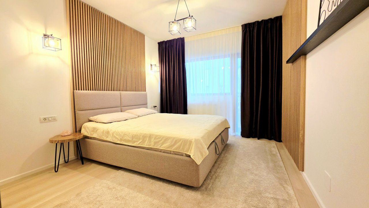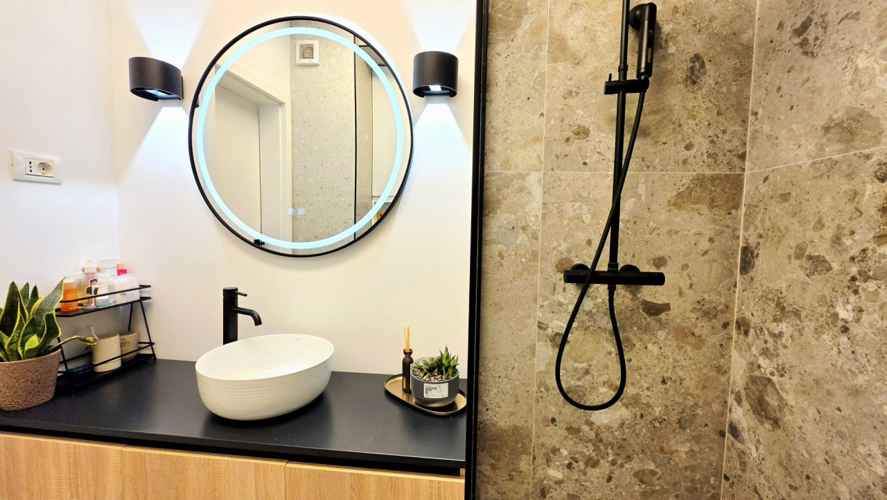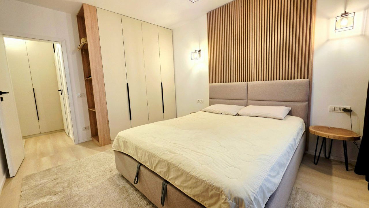 Dormitorul, de asemenea minimalist, dotat cu un pat King Size marginit de noptiere si lampi ambientale si o comoda TV se regaseste langa baia cu cabina walk-in si aerisire.