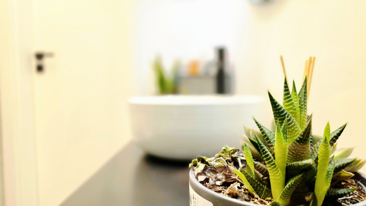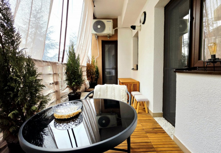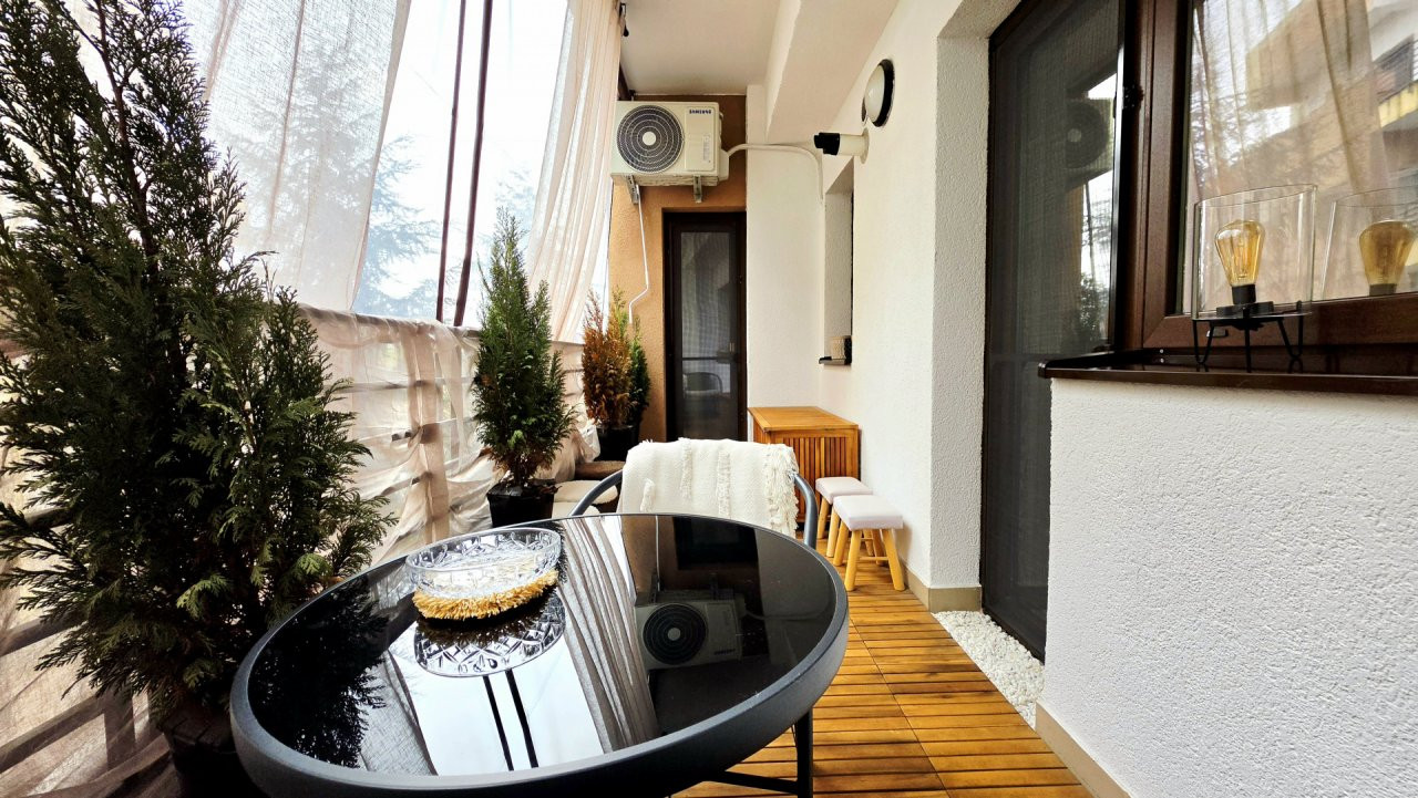 Terasa apartamentului, marginita cu balustrada de metal si jaluzele transparente pentru a te feri de vant si ploaie, ofera un plus pentru fumatori sau pentru cei care doresc sa lucreze sau sa serveasca masa in aer liber