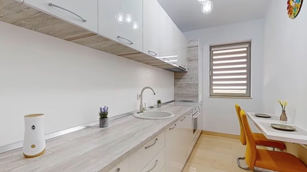 Apartamentul, decomandat, este situat la etajul 1 și oferă un nivel ridicat de confort încă de la intrare. A fost amenajat cu mult bun gust, sub îndrumarea unui designer, într-un stil modern, minimalist și extrem de funcțional.