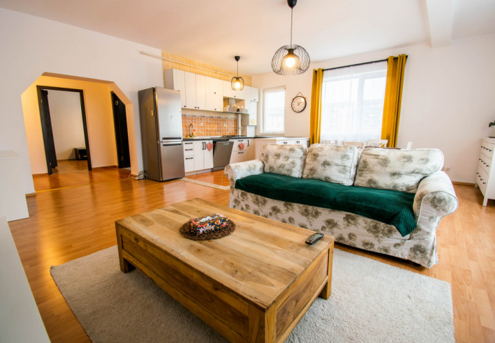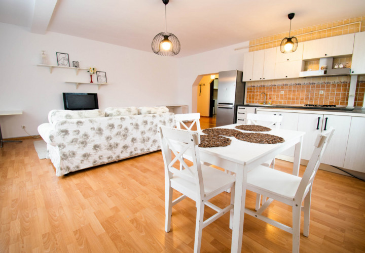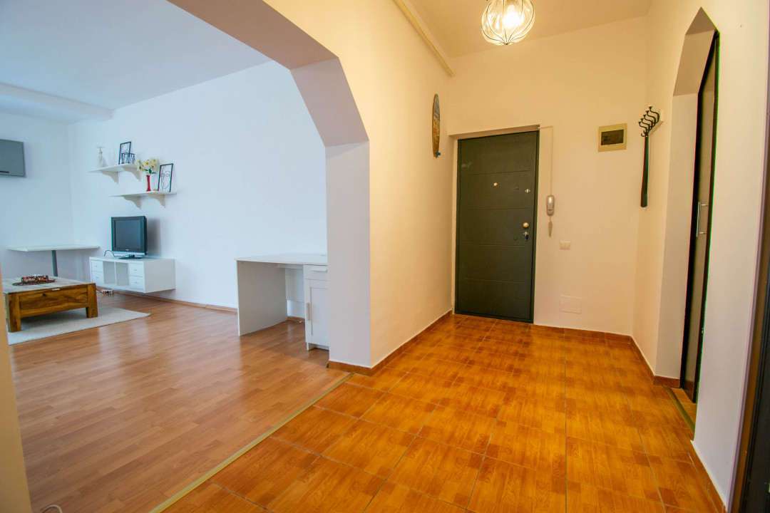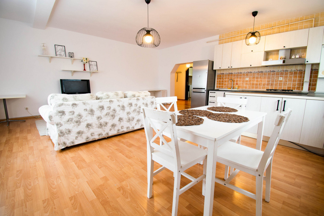 Din hol avem acces la un dresing generos in suprafata de 6 mp ,living open space cu bucataria dotata cu hota profesionala ,masina de spalat vase ,frigider,cuptor,plita,incalzire prin centrala termica de apartament(noua,a fost schimbata recent),doua aere conditionate, usa metalica noua la intrare .Proprietatea este foarte bine compartimentata asigurand locul ideal pentru activitatile cotidiene ale unui cuplu cat si pentru o persoana . Imobilul se inchiriaza asa cum se vede in fotografii!