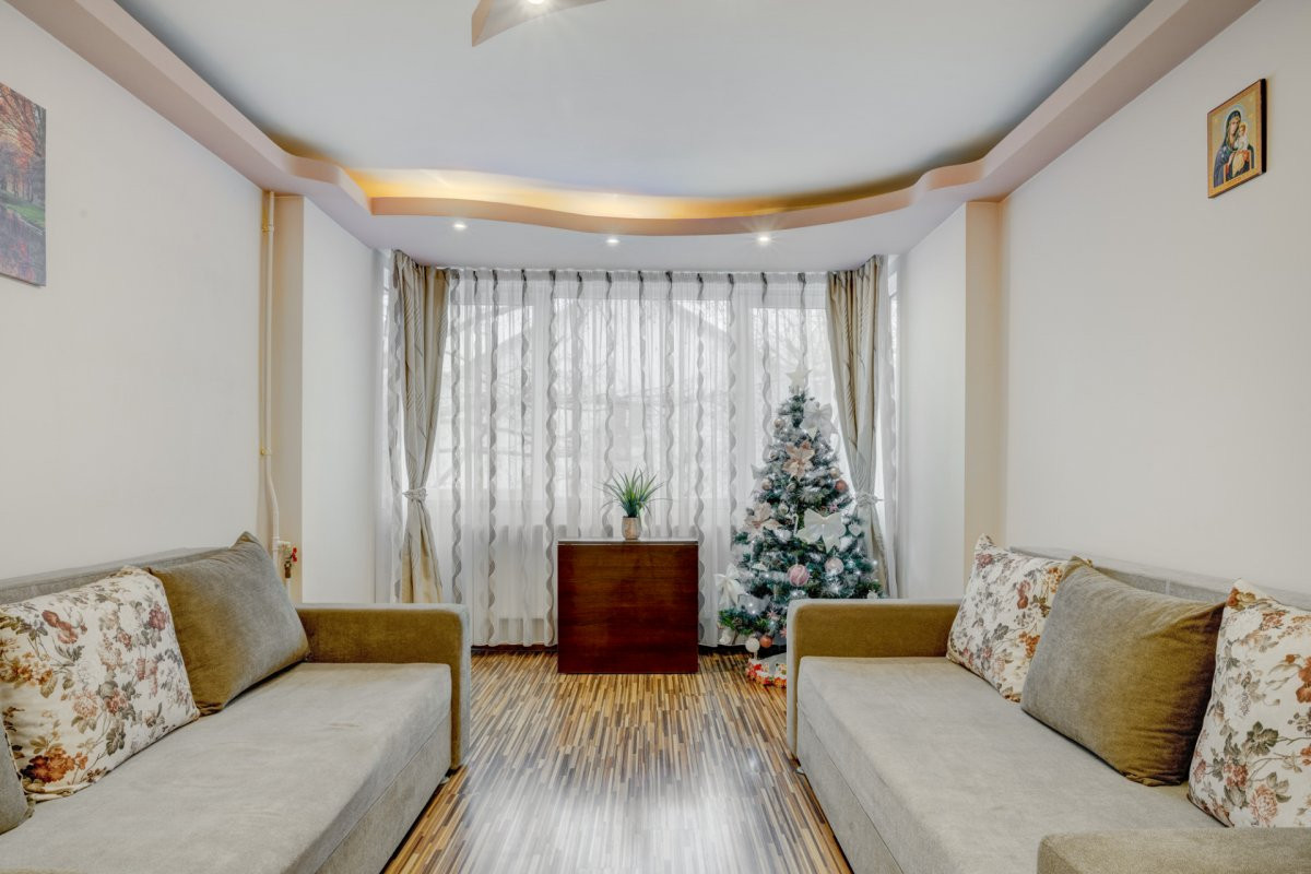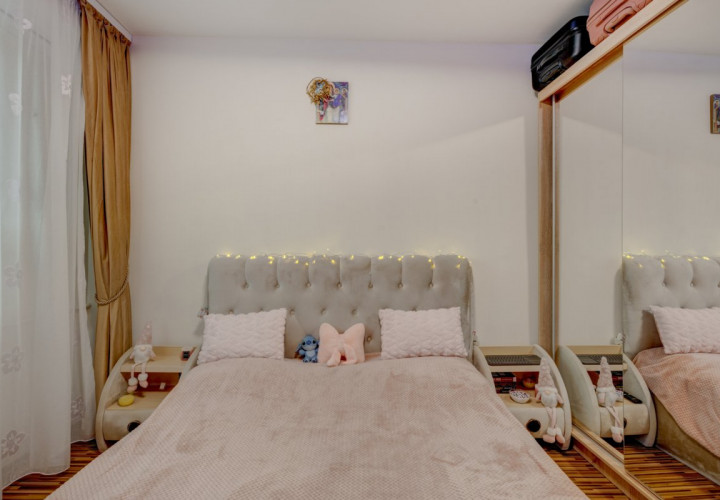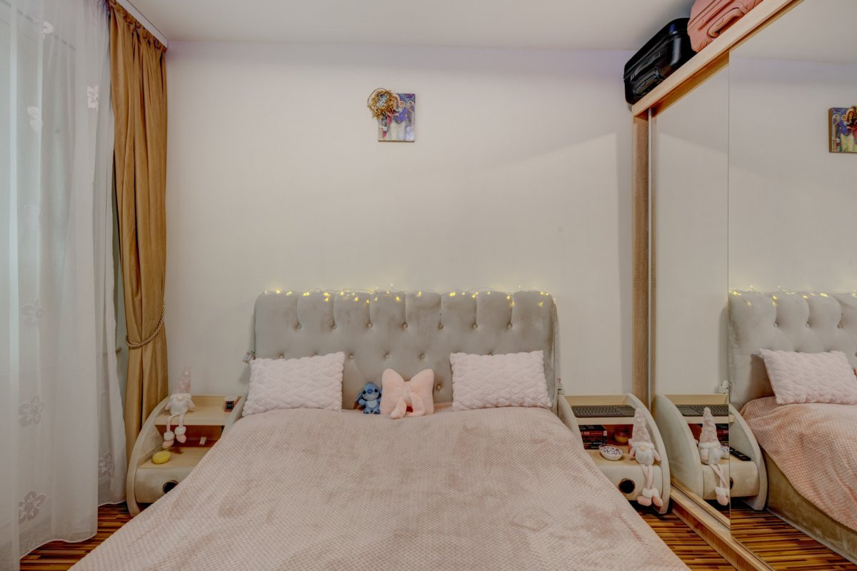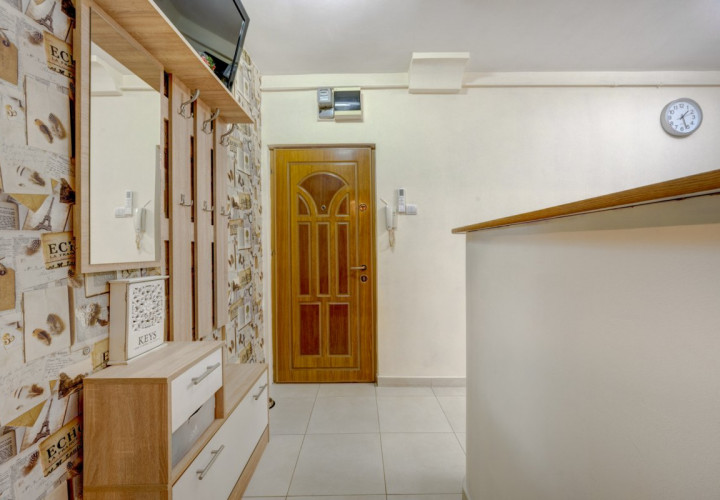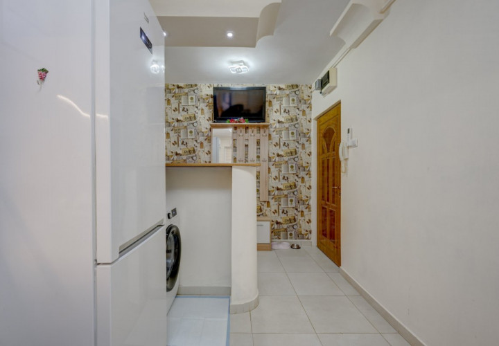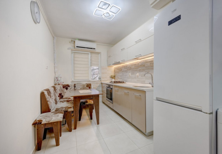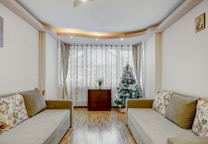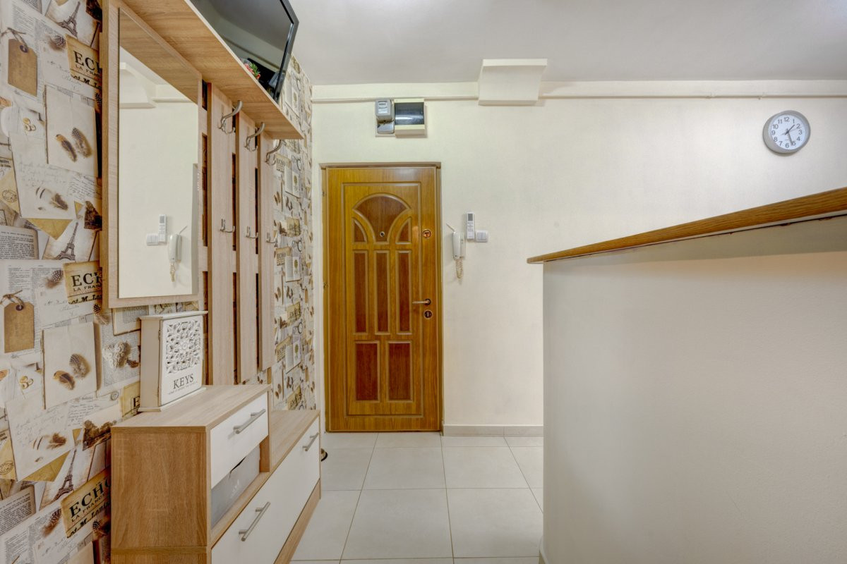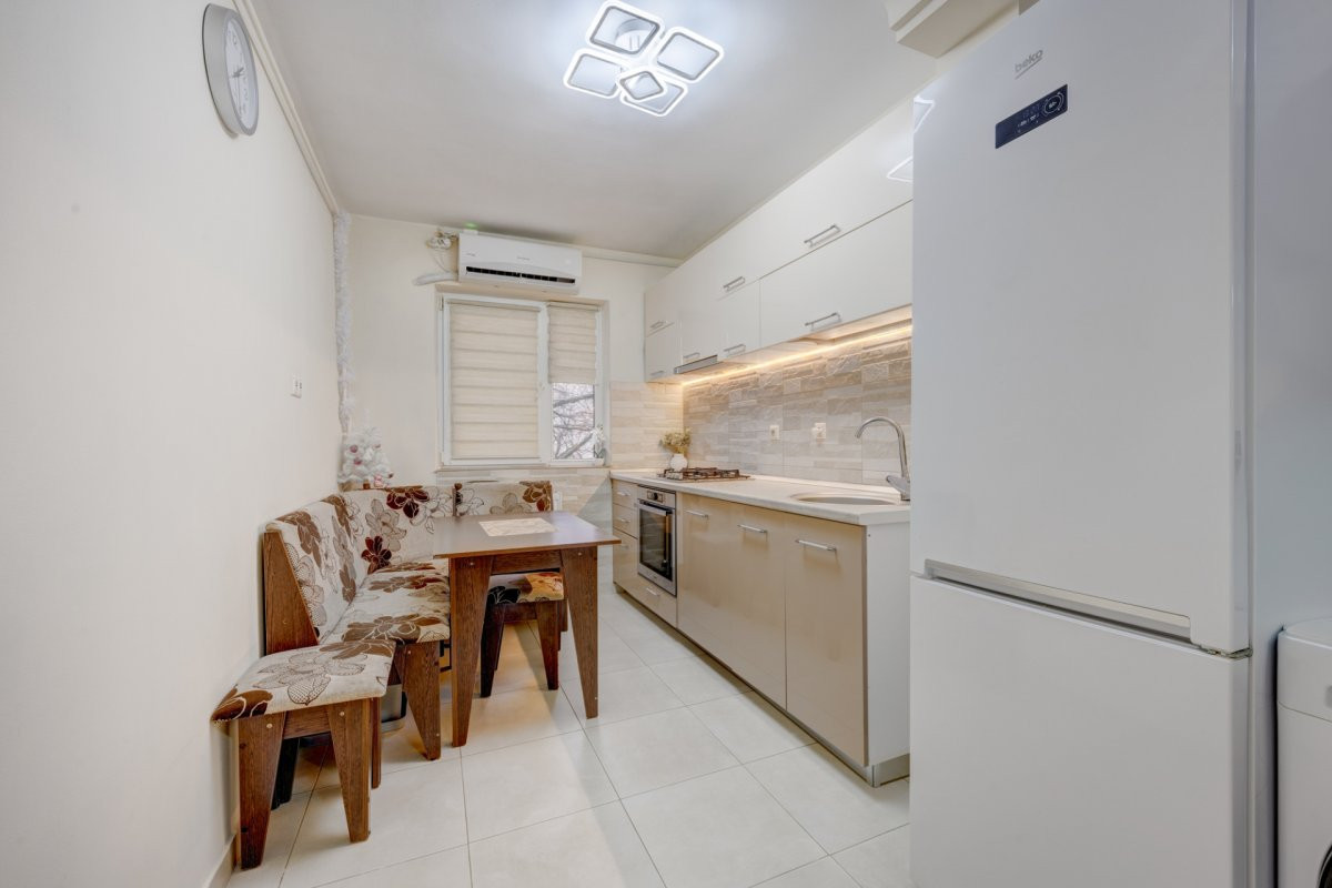 Apartamentul se vinde complet mobilat si utilat. Bucataria a fost renovata integral in urma cu 2 ani, mobilata si utilata cu plita, cuptor, hota, masina de spalat vase, masina de spalat rufe si frigider. Mobilierul din living si dormitor este achizitionat recent (2 ani). Este dotat cu 2 aparate de aer conditionat instalate in urma cu 1 an.