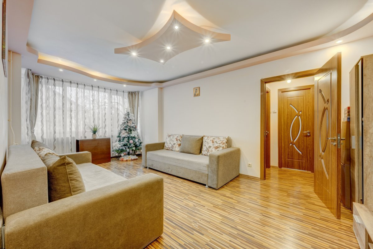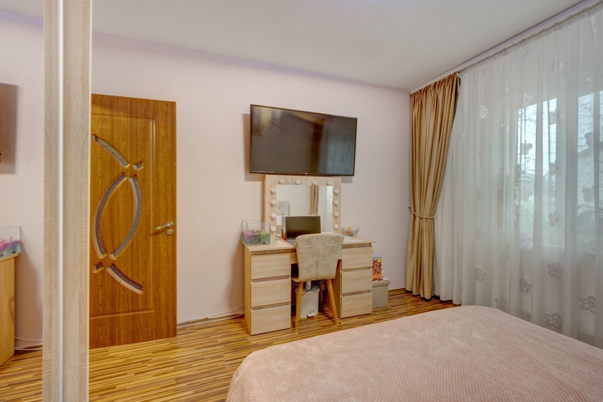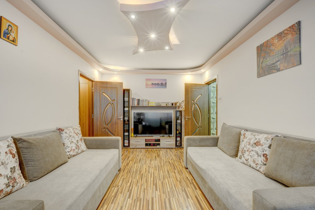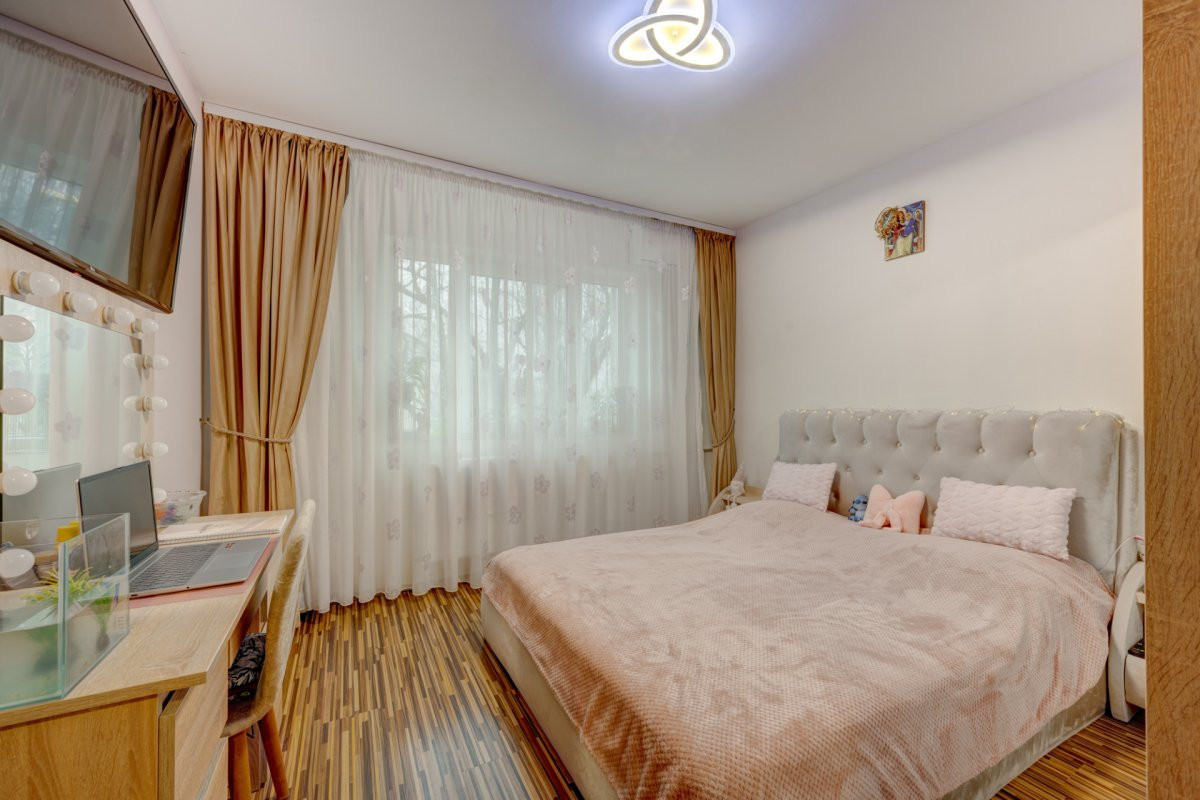 Apartamentul este in stare foarte buna si a fost zugravit recent. Instalatia electrica este schimbata integral, caloriferele au fost si ele inlocuite si toate instalatiile sanitare. Toate ferestrele au tamplarie PVC cu geam termopan, toate usile interioare au fost schimbate iar pardoselile sunt placate cu parchet laminat in camere si gresie( hol, baie si bucatarie). Baia este singura care nu este renovata recent.