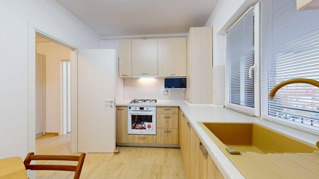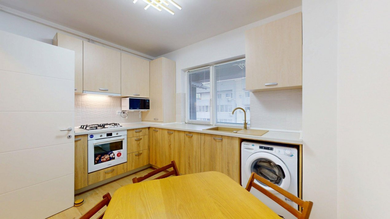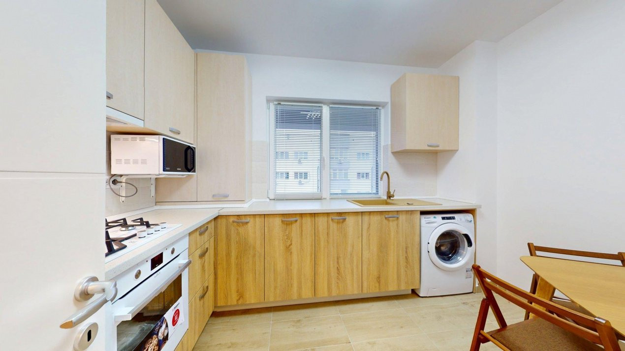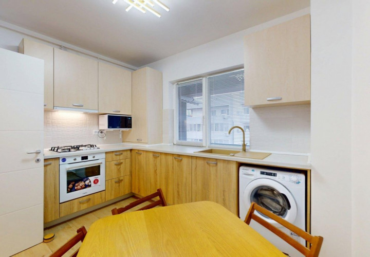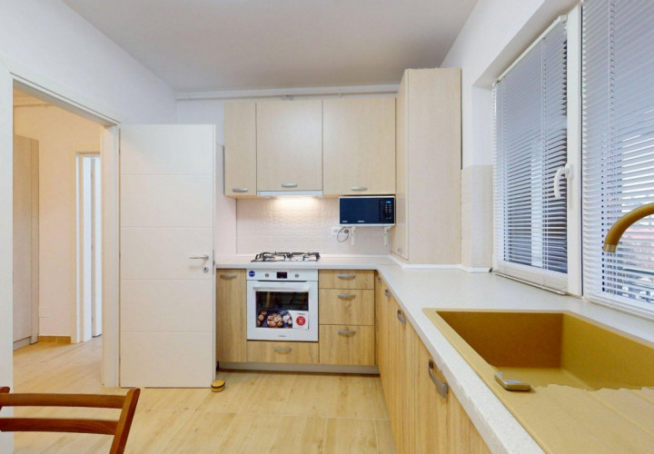Bucătăria este complet mobilată și utilată cu electrocasnice de calitate – Electrolux, Hansa și Beko – pregătită să devină locul unde diminețile încep cu energie și serile se încheie relaxat.