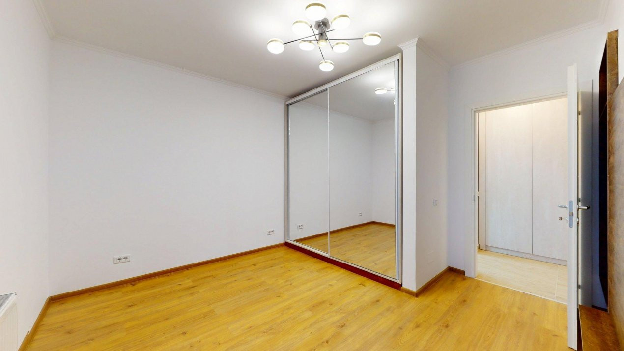 Dormitorul oferă un spațiu de odihnă aerisit, dotat cu un dressing cu uși culisante placate cu oglindă și un corp decorativ ce adaugă personalitate.