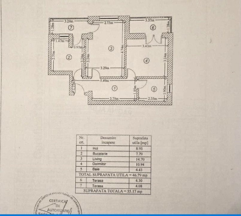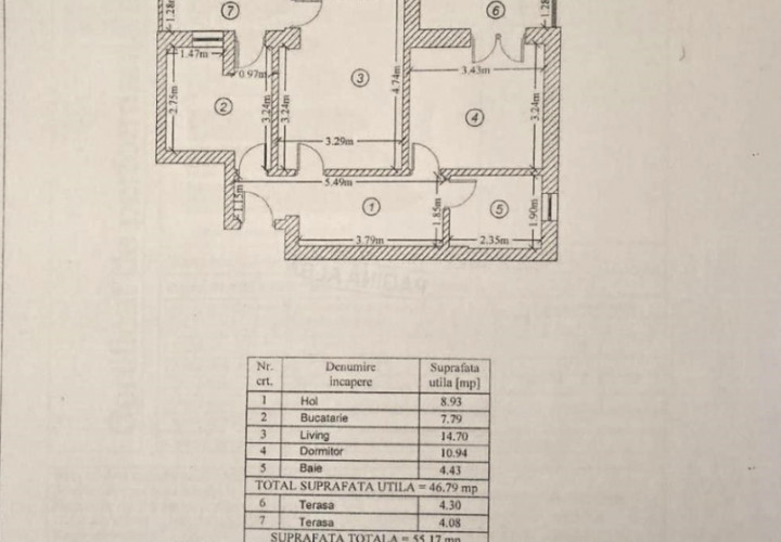 Locuința are o suprafață utilă de 47 mp la care se aduga cele doua balcoane in suprafata de 8.38 mp ,in total 55,17 mp .