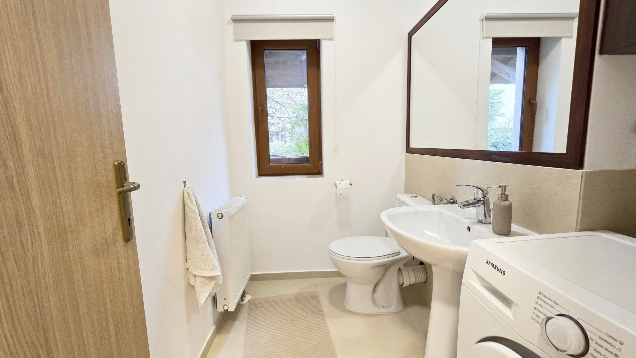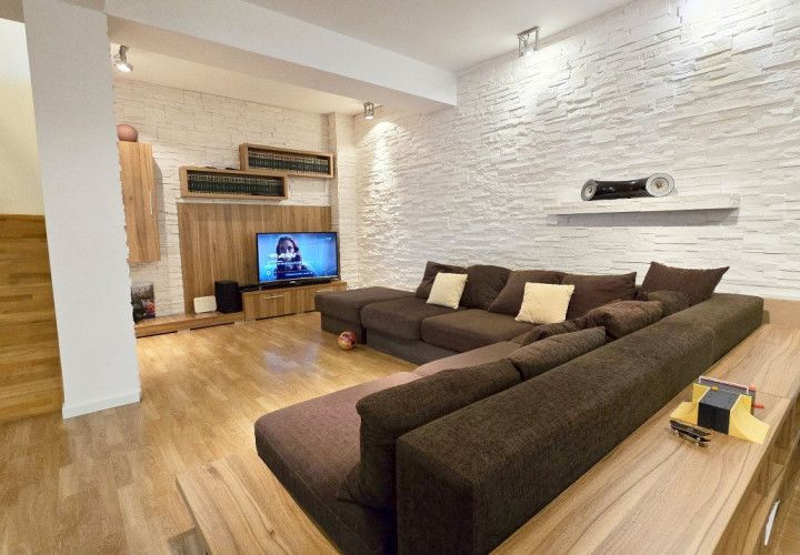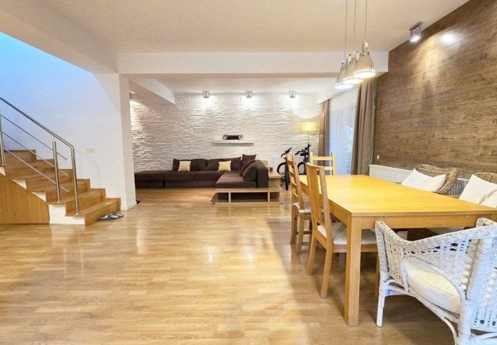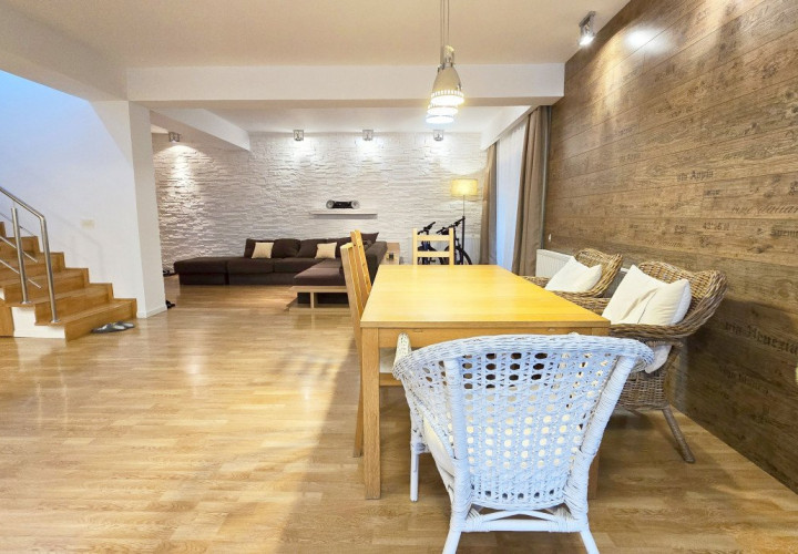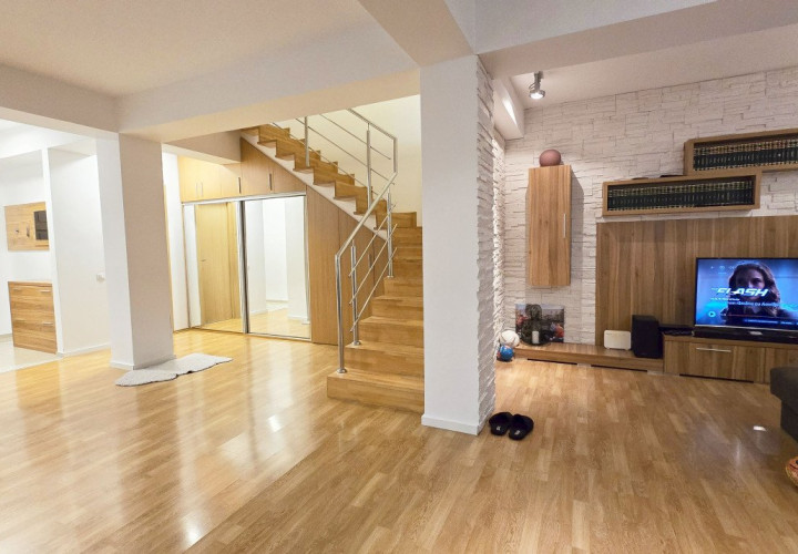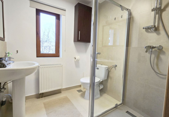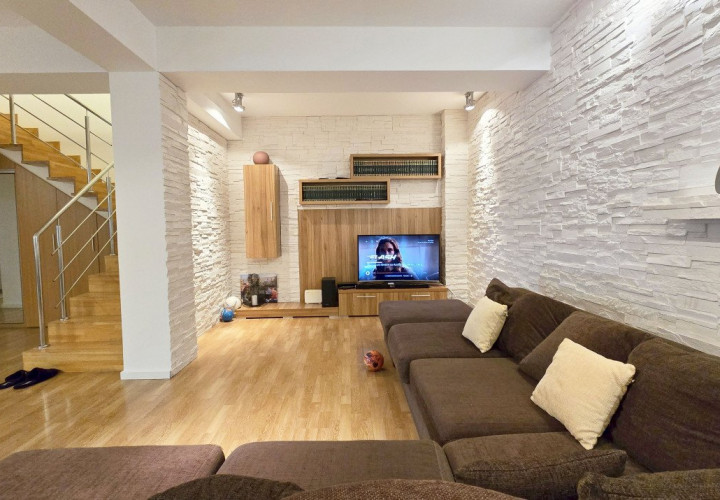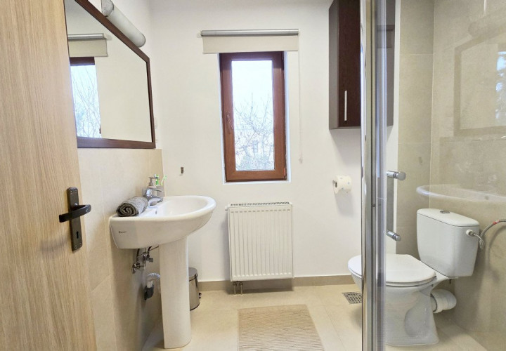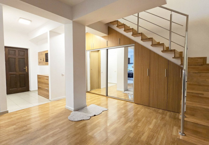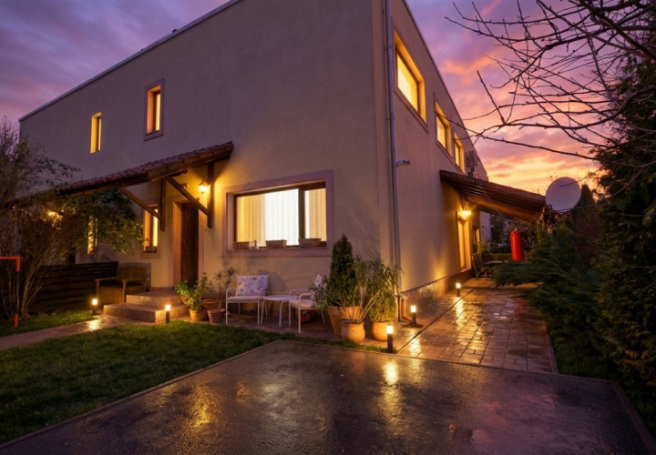 Altfel, casa, pe cat de generoasa si confortabila, este pe atat de intima, atat cat isi doreste orice familie doritoare de liniste si confort sporit. Caci, in completarea livingului imens cu bucatarie deschisa si echipata complet, a dinning-ului si grupului sanitar de la parter, se regasesc la etaj doua dormitoare individuale, o baie si un dormitor matrimonial cu baie proprie, toate in aceeasi nota reconfortanta.
