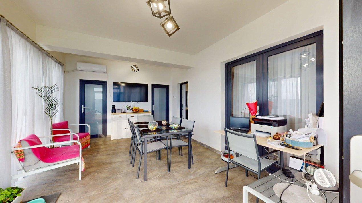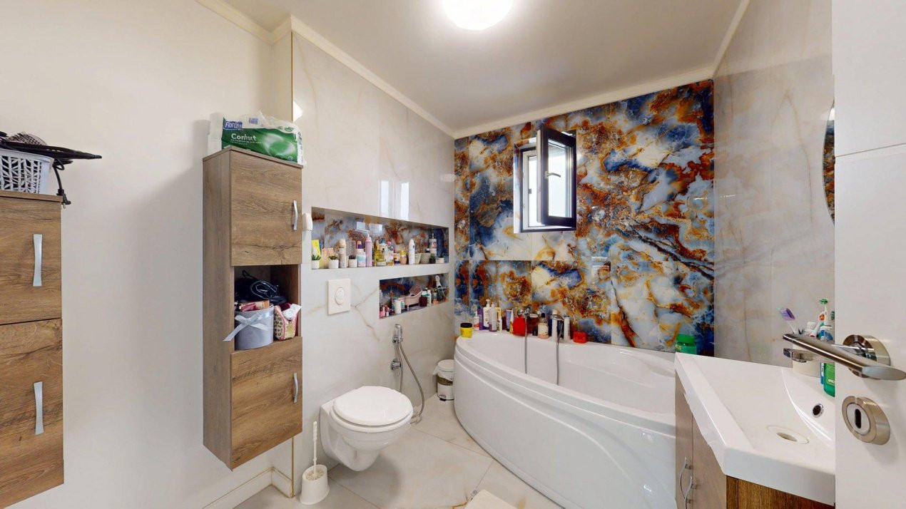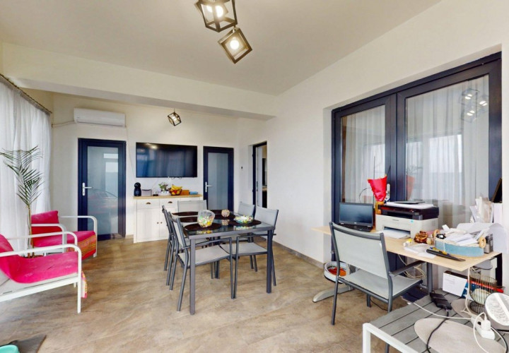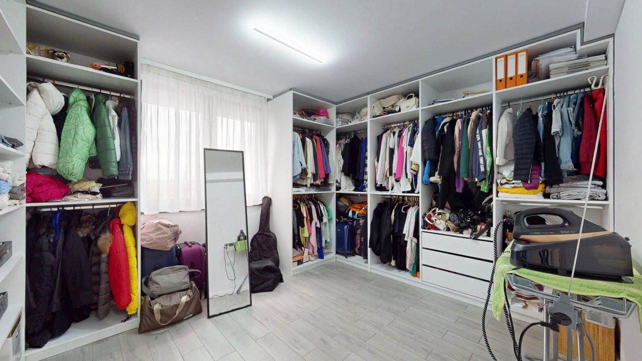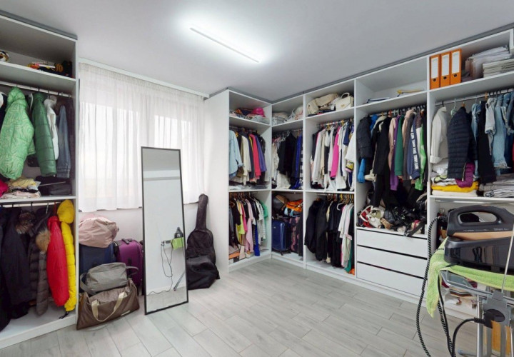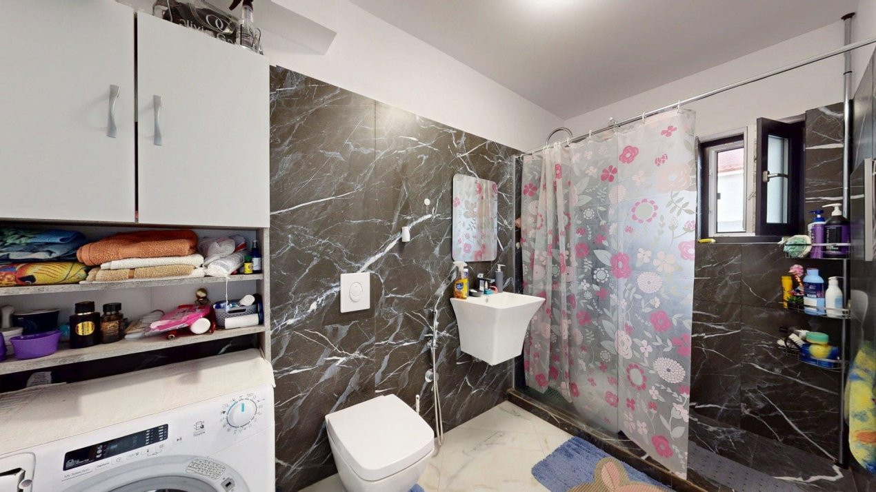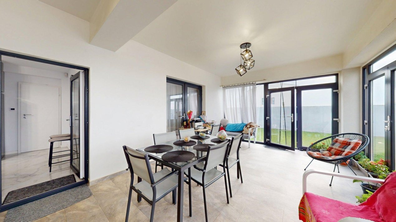 Terasa reprezintă un punct forte al locuinței — închisă cu suprafețe vitrate mari, izolată termic și dotată tot cu încălzire în pardoseală, aceasta poate fi utilizată confortabil în orice sezon. În plus, terasa integrează perfect două spații suplimentare extrem de utile: o baie cu duș și o zonă tehnică prevăzută cu spațiu generos pentru depozitare.