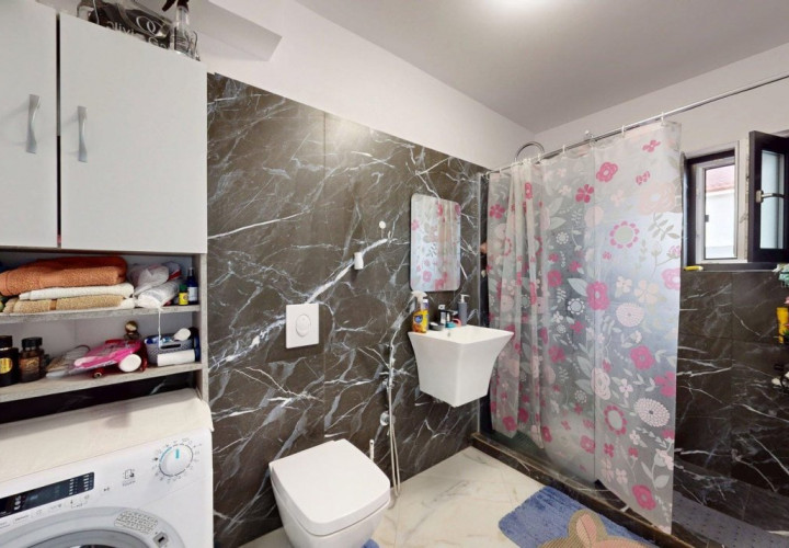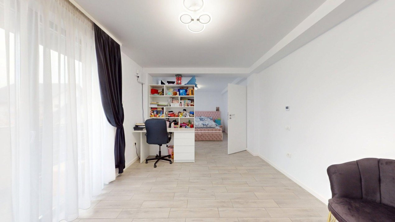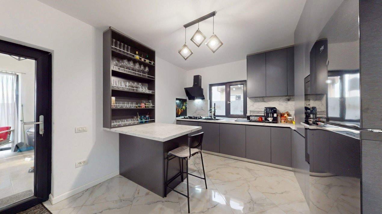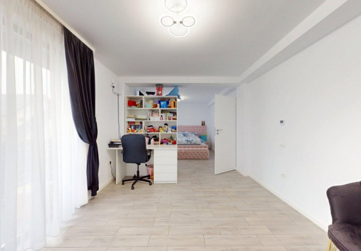 Parterul este conceput pentru funcționalitate și adaptabilitate: o cameră versatilă poate fi transformată cu ușurință în dormitor, birou sau spațiu hobby, în funcție de nevoile fiecărui membru al familiei; livingul generos, scăldat în lumină naturală, devine locul ideal pentru relaxare; iar bucătăria, amplă și luminoasă, are acces direct către terasa proprietății, iar baie modernă cu duș și aerisire proprie sporește utilitatea zonei de zi.