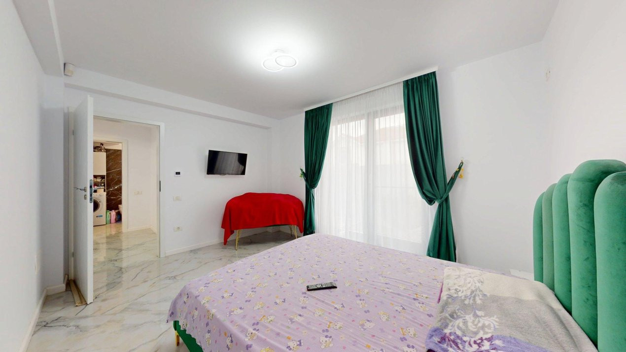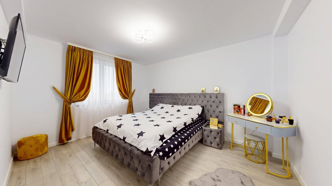 La etaj, zona de noapte este bine organizată și oferă intimitate. Cele trei dormitoare sunt luminoase și bine proporționate, iar unul dintre ele impresionează prin suprafața utilă de 27 mp, transformându-se într-un veritabil dormitor matrimonial. Baia de la etaj, dotată cu cadă și aerisire naturală, deserveste întreaga zonă.