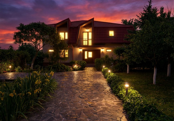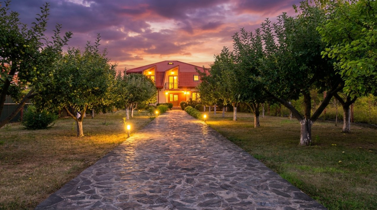Intrand in curte printre portile automate, parcand pe unul dintre cele 3 locuri acoperite, poti vedea lesne, chiar de la o distanta considerabila, casa cu arhitectura frumoasa amplasata pe fundalul curtii, in spatele livezii.