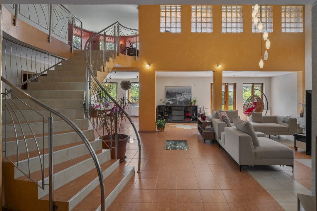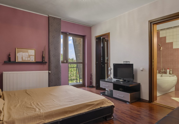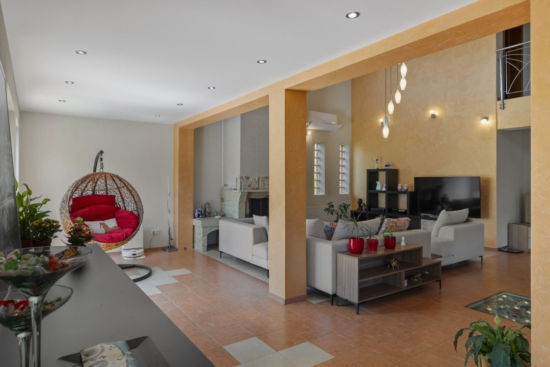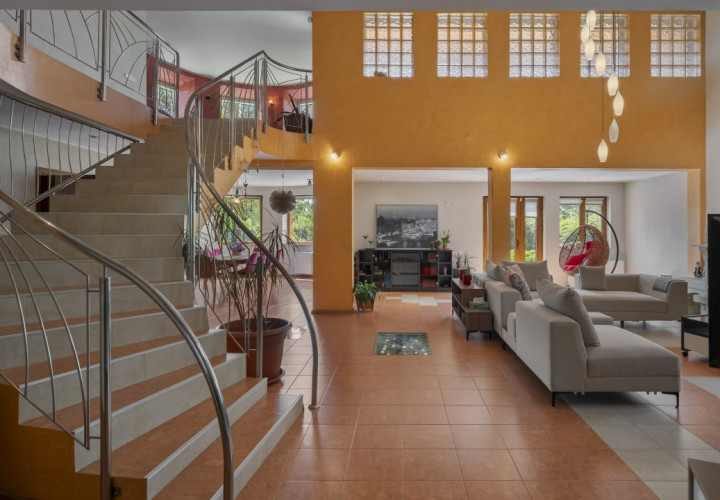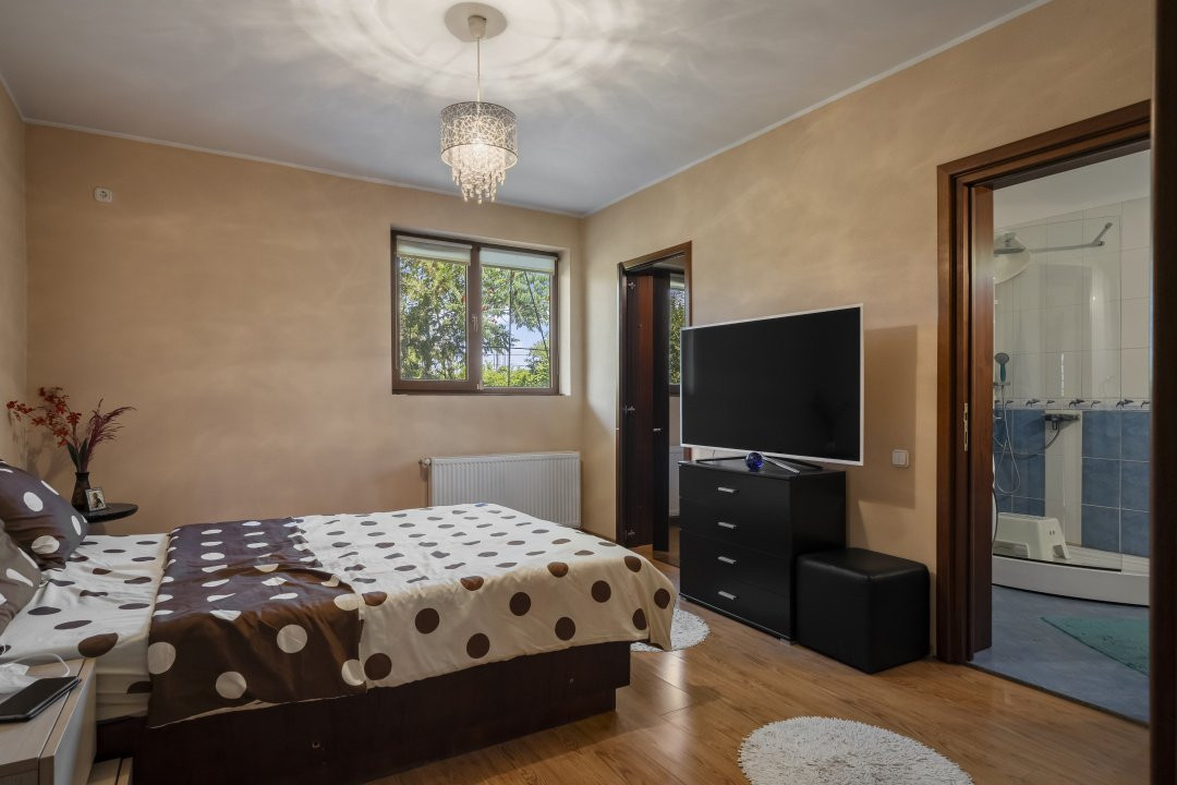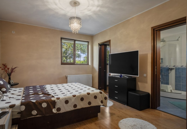 Scara interioara generoasa, curbata, conduce catre holul imens de la etaj cu vedere catre living si acces in terasa ce iti confera un peisaj placut ochiului, al zonei din spatele casei. Dormitoarele in numar de 5, fiecare cu baie proprie, sunt comandate de holul larg, de asemenea cu vedere catre living-ul parterului.