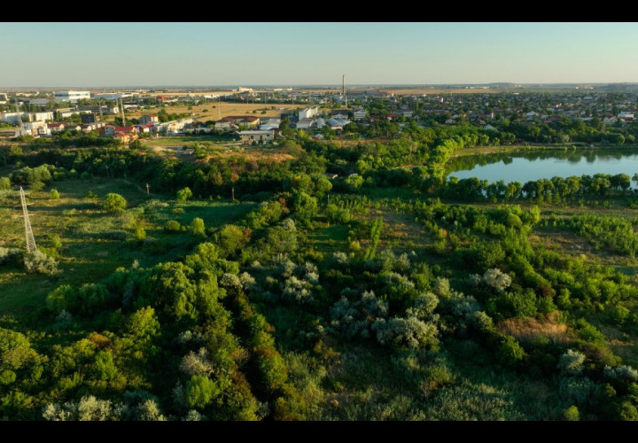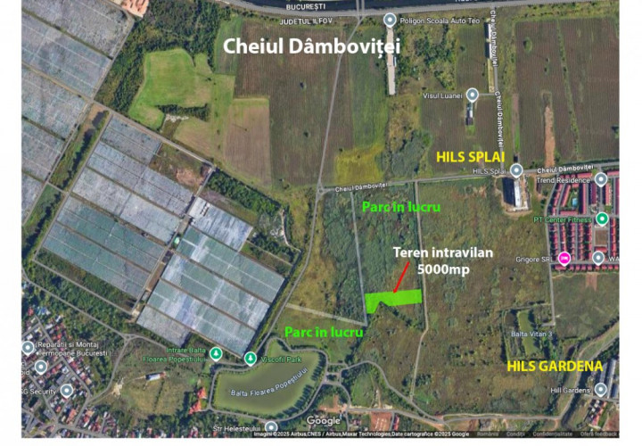 Poziționat excepțional, chiar între două parcuri aflate în lucru- unul prin mărirea suprafeței verzi a parcului deja existent- Balta Floarea Popeștiului - iar celălalt fiind un parc nou, de tip urban, în curs de amenajare, terenul de 5000mp are deschidere către 2 drumuri. Cele două deschideri la stradă au lungimi diferite, dată fiind configurația neregulată a parcelei- o deschidere de 28 ml și o alta de 39 ml. Cele două străzi se află momentan în lucru și vor conecta atât Cheiul Dâmboviței cu șoseaua Leordeni cât și Leordeni cu zona Viscofil.